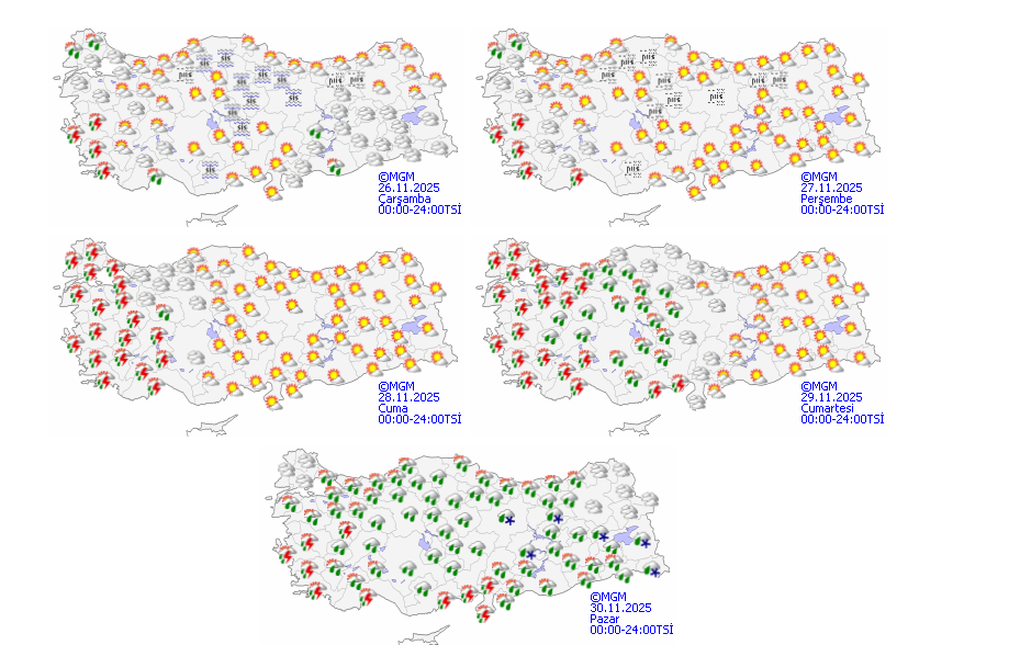 30 Kasım Pazar yağışlar zayıflamış hâlde Türkiye genelinde etkisini sürdürecek. Ege, Akdeniz ve Marmara’da hafif yağış geçişleri; İç Anadolu ve Karadeniz’de yer yer kuvvetlenen sağanaklar bekleniyor.