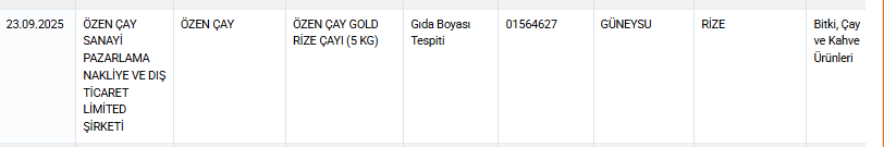 Özen Çay Sanayi’ye ait Özen Çay Gold Rize Çayı (5 kg) ürününde gıda boyası tespit edildi. İl: Rize/Güneysu, Parti No: 01564627.